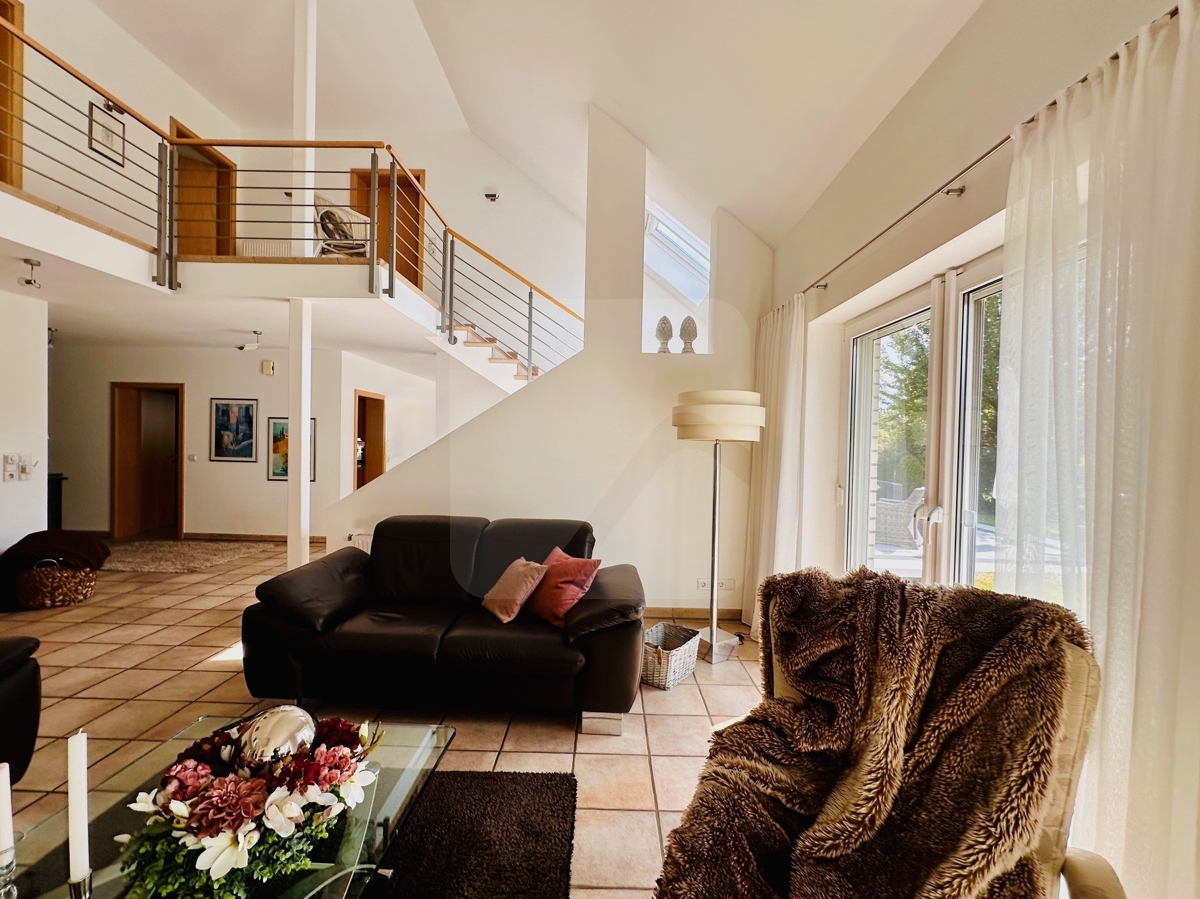 Von hier aus betreten Sie eine der beiden Terrassen, verweilen vor dem Kamin oder lassen den Blick vom Sofa in die offene Galerie im Obergeschoss schweifen.