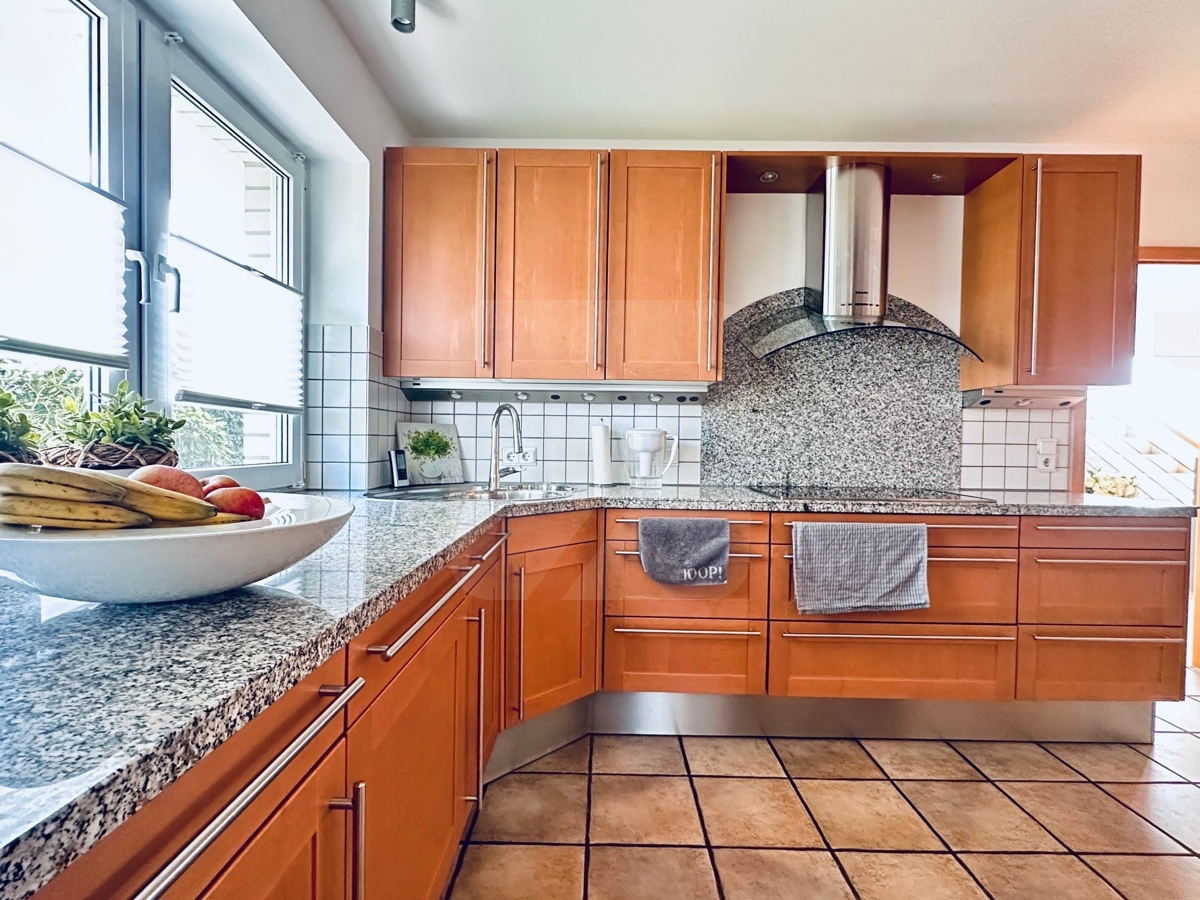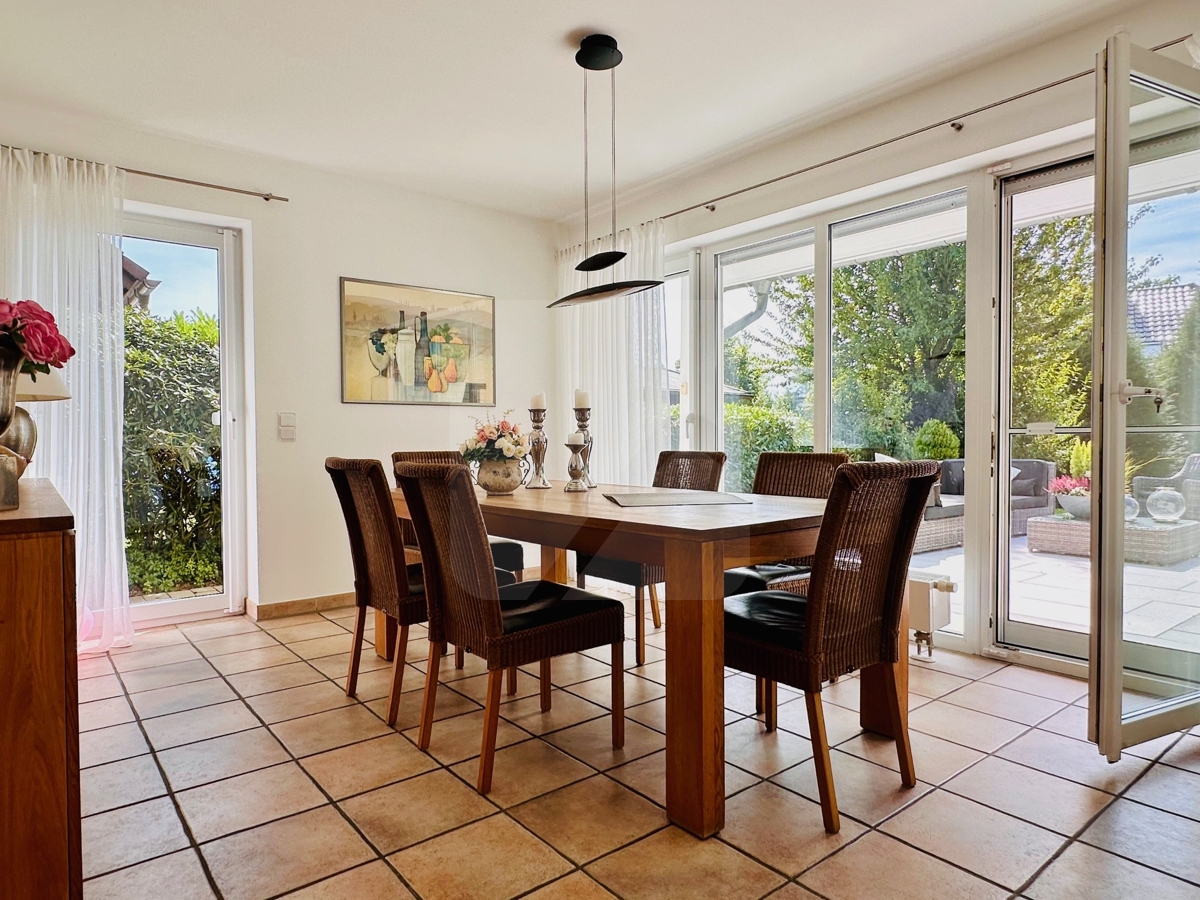 Angrenzend an den Wohnbereich bietet das Esszimmer einen Zugang zu der zweiten Terrasse sowie in die geräumige Küche des Hauses.