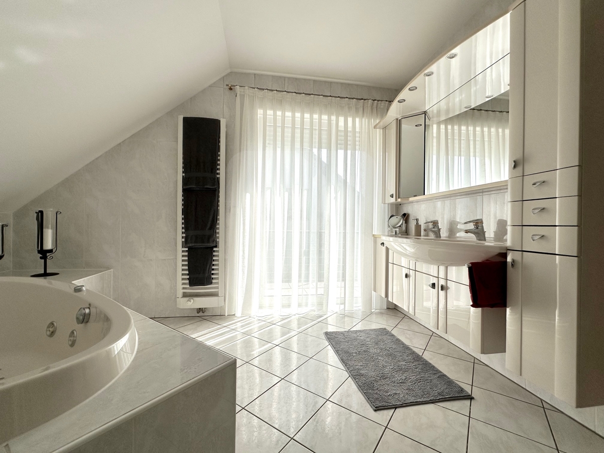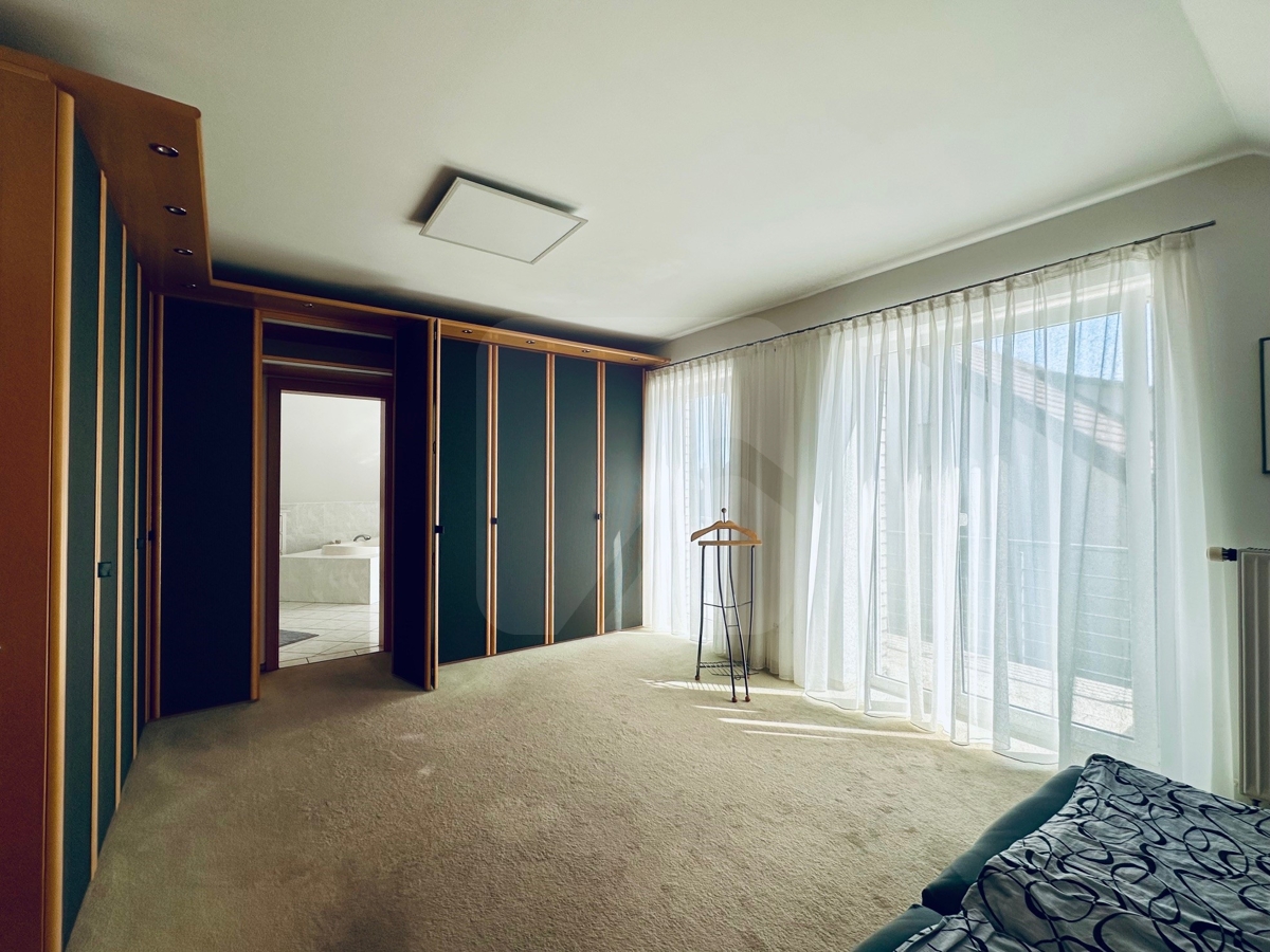 Das Hauptschlafzimmer des Hauses ist mit Ensuite-Badezimmer inklusive Whirlwanne und Dusche ausgestattet. Hier befindet sich auch der zweite Balkon des Hauses.