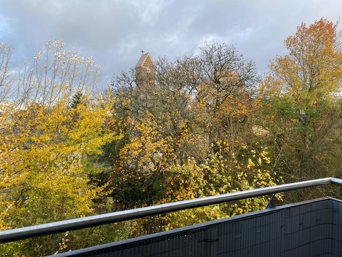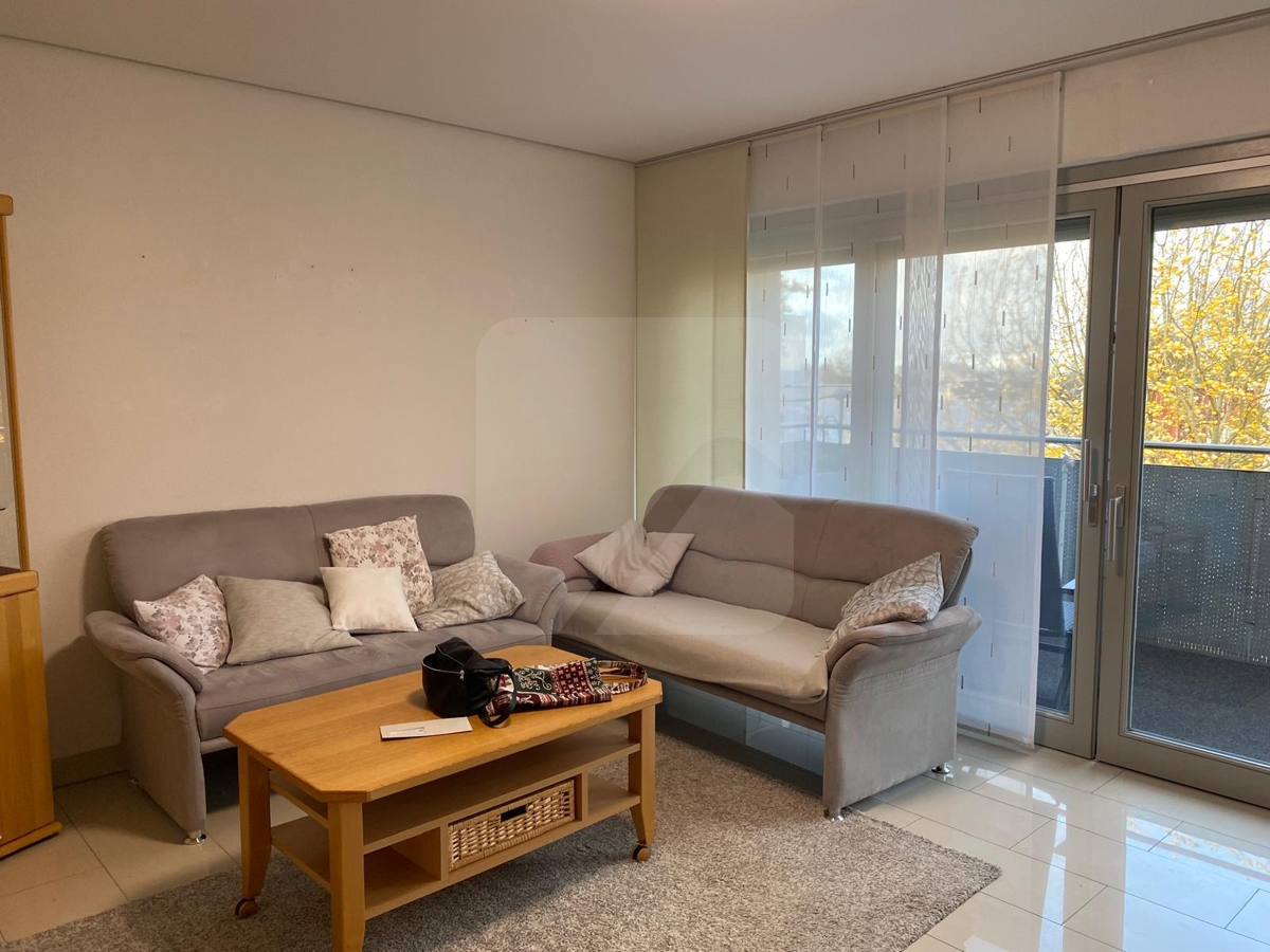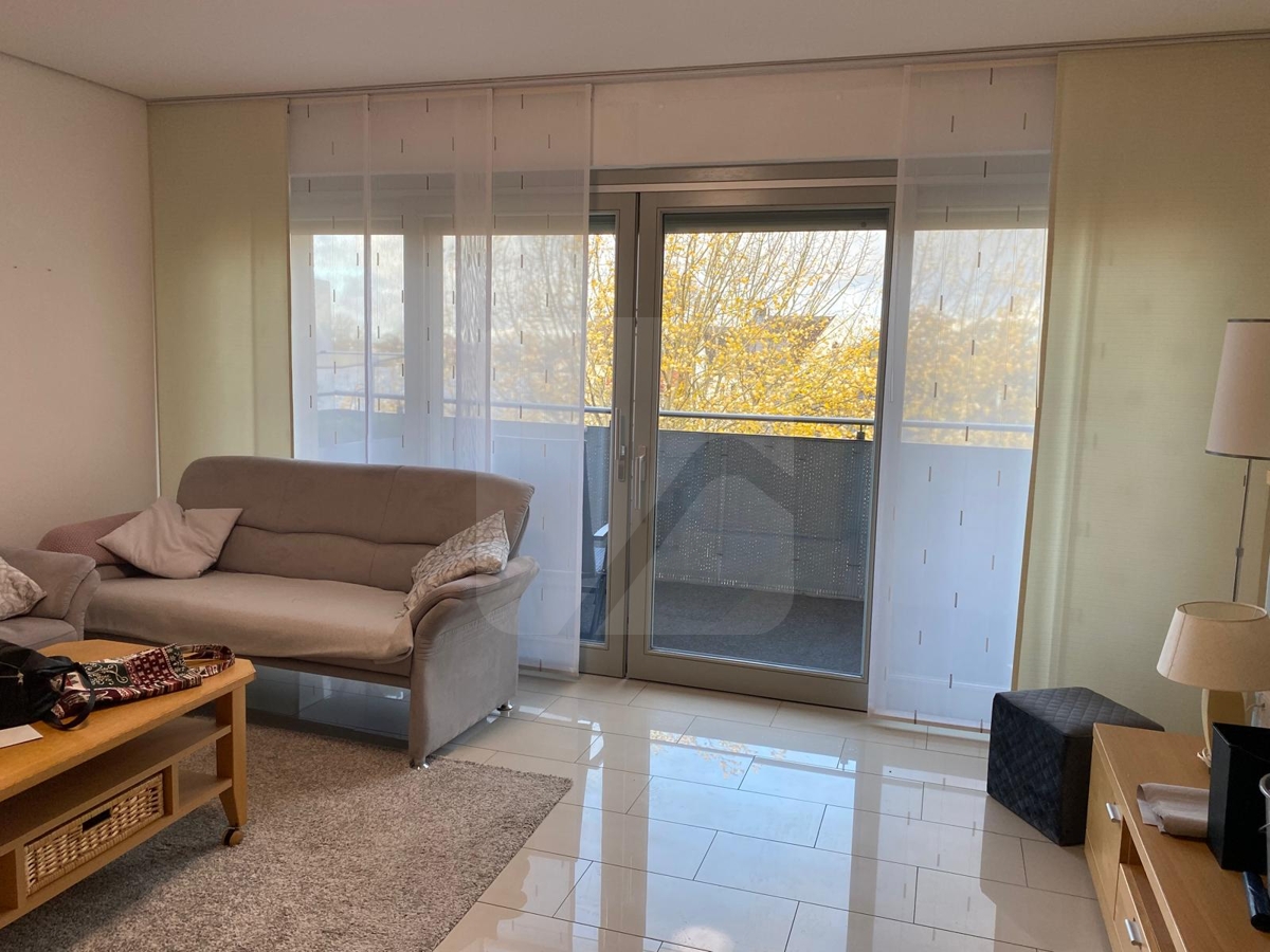 Die großen Fenster im Wohnzimmer sorgen für viel Tageslicht, Wohlfühlatmosphäre und visuelle Großzügigkeit. Von dort gelangen Sie auf den großen Balkon mit schöner Aussicht.