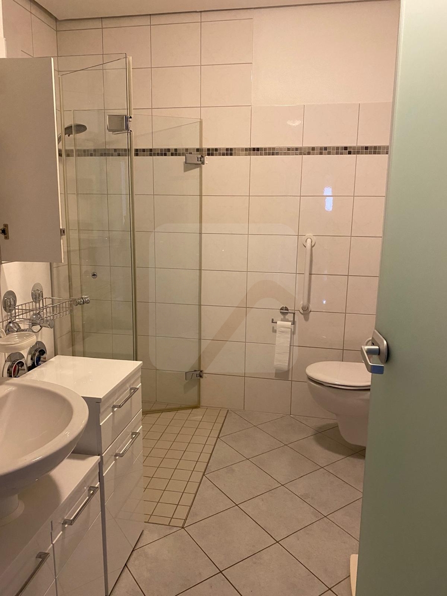 Für warme Füße sorgt die Fußbodenheizung und zeitlose, helle Fliesen schaffen ein freundliches Raumgefühl.