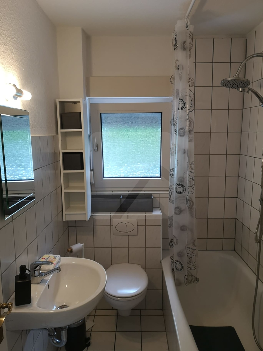 Das Badezimmer ist hell gefliest und mit einer Badewanne ausgestattet, dazu gehört ein Fenster, das für natürliches Licht sorgt.