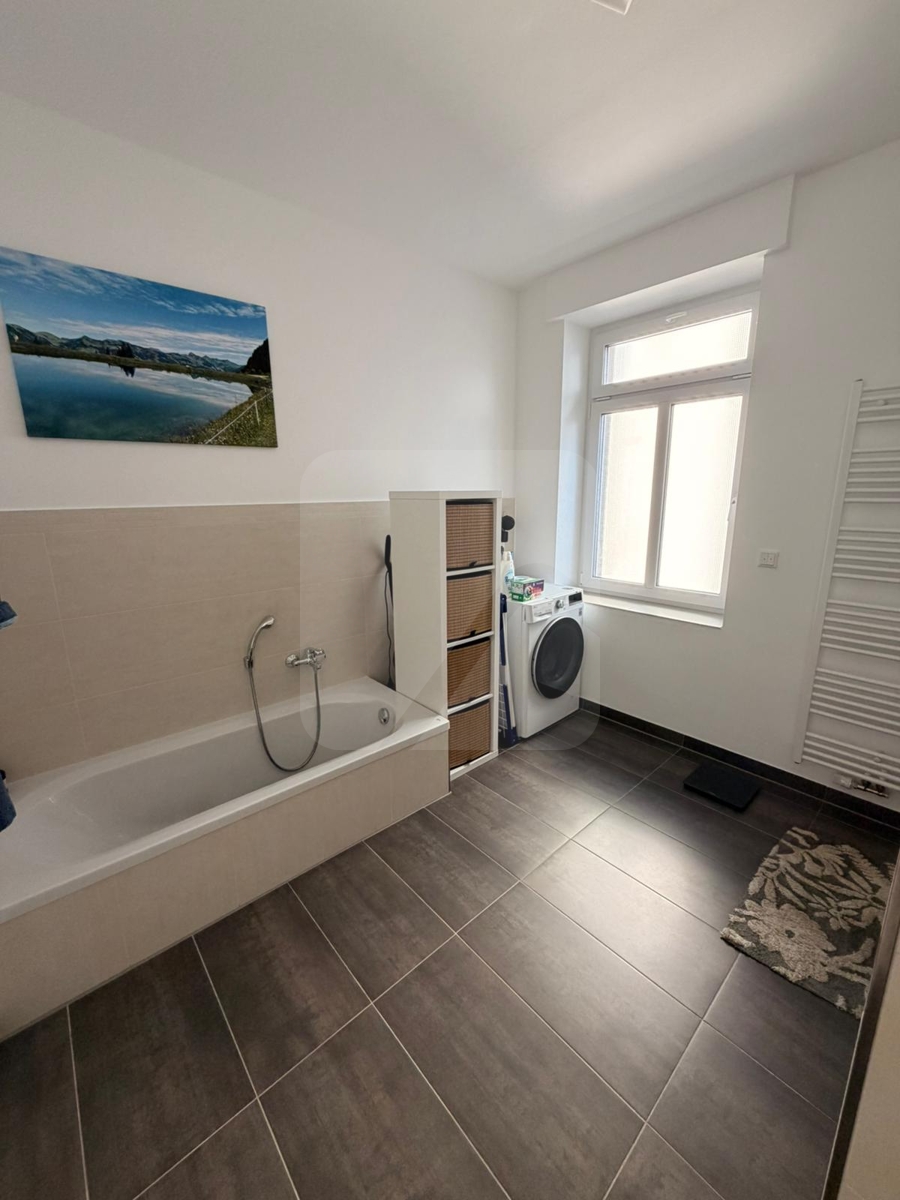 Das Fenster sorgt für natürliches Tageslicht und frische Luft. Die Wanne lädt zur entspannten Auszeit ein, während die ebenerdige Dusche zeitgemäßen Komfort bietet