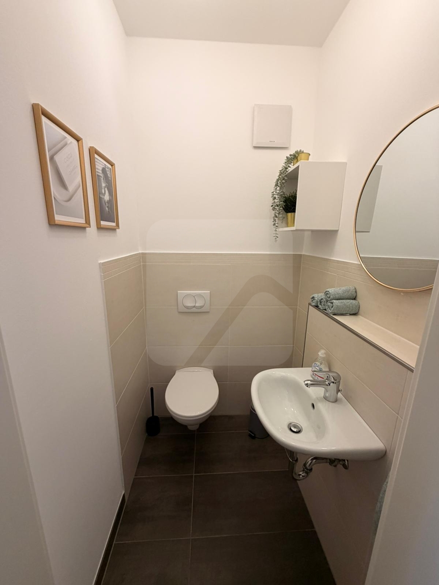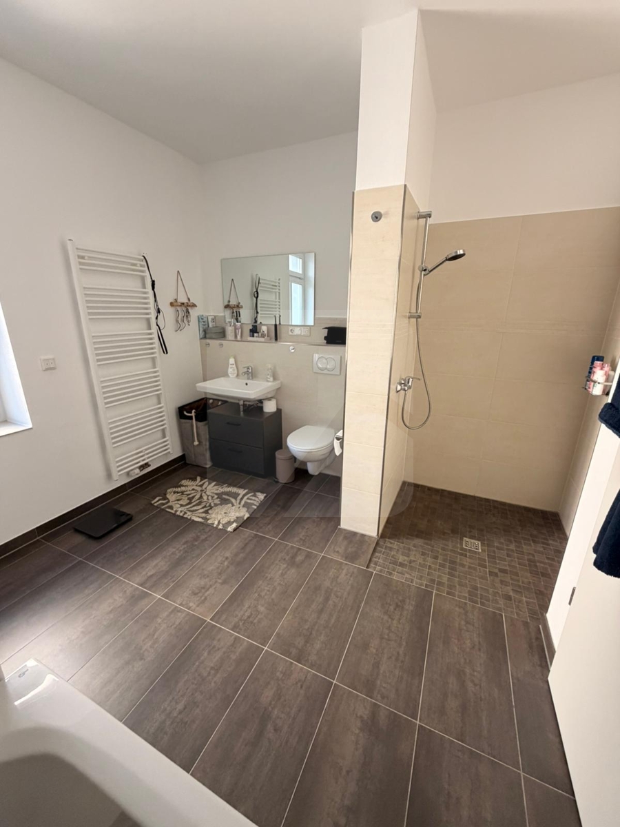 Das Badezimmer ist hochwertig ausgestattet und mit modernen Fliesen versehen, was für ein elegantes und zeitgemäßes Ambiente sorgt.